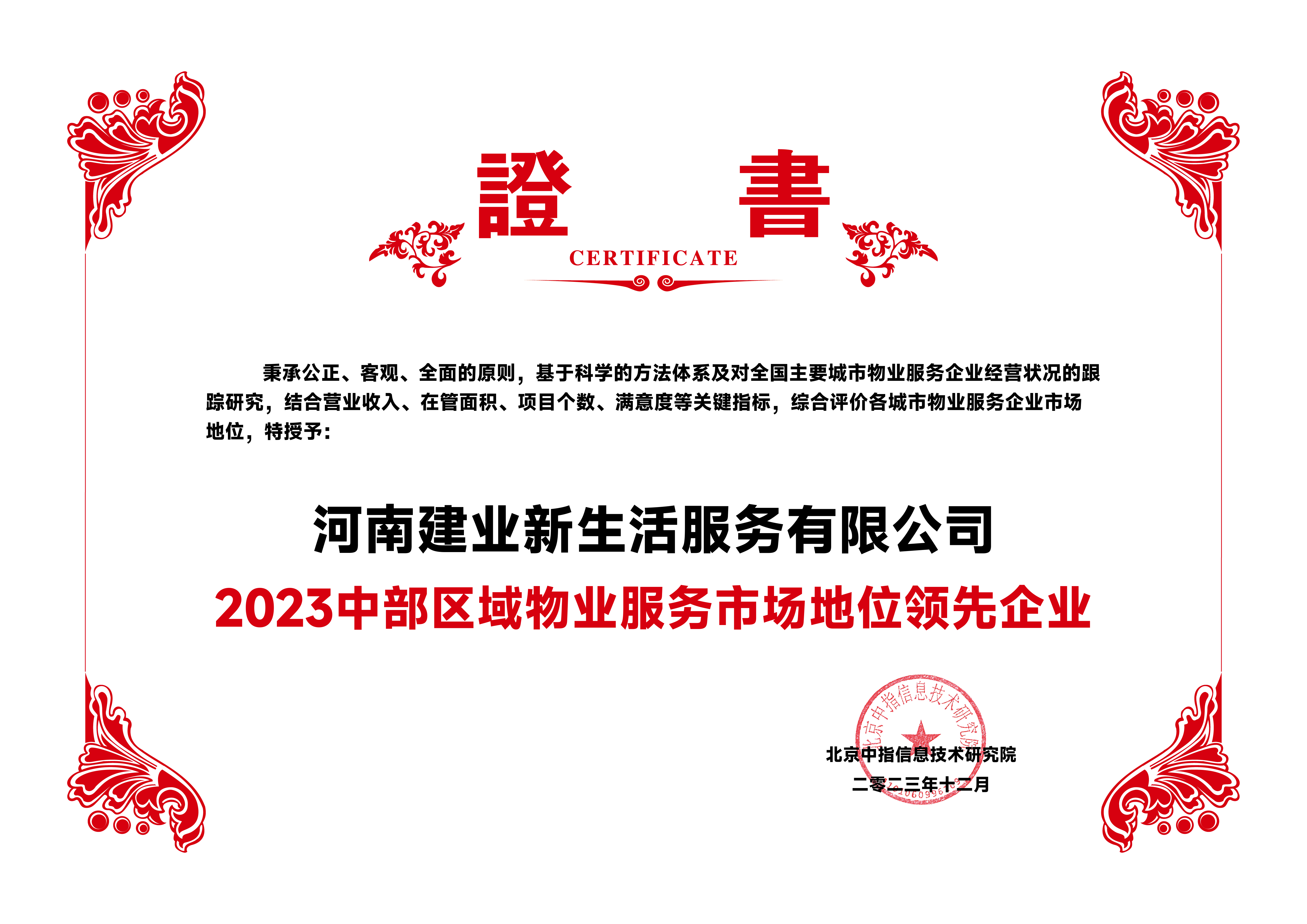 2023年12月7日,由北京中指信息技術研究院主辦,中國房地產指數(shù)系統(tǒng)、中國物業(yè)服務指數(shù)系統(tǒng)承辦的“2023中國房地產大數(shù)據(jù)年會暨2024中國房地產市場趨勢報告會”在北京隆重召開。河南建業(yè)新生活服務有限公司憑借雄厚的綜合實力,榮膺“2023中部區(qū)域物業(yè)服務市場地位領先企業(yè)(TOP1)”“2023河南省物業(yè)服務市場地位10強企業(yè)(TOP1)”。