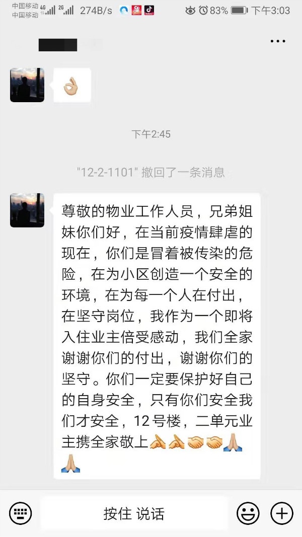 一位建業(yè)業(yè)主,同時(shí)也是集團(tuán)高層領(lǐng)導(dǎo),當(dāng)她看到奮戰(zhàn)在一線、可敬又可愛的建業(yè)物業(yè)人,每天每一時(shí)刻用血肉之軀,筑起業(yè)主安全的長(zhǎng)城時(shí),特別感動(dòng)、特別感謝,多次流下眼淚,特發(fā)來(lái)2萬(wàn)元紅包給一線的物業(yè)員工,助力物業(yè)防疫工作的進(jìn)行!